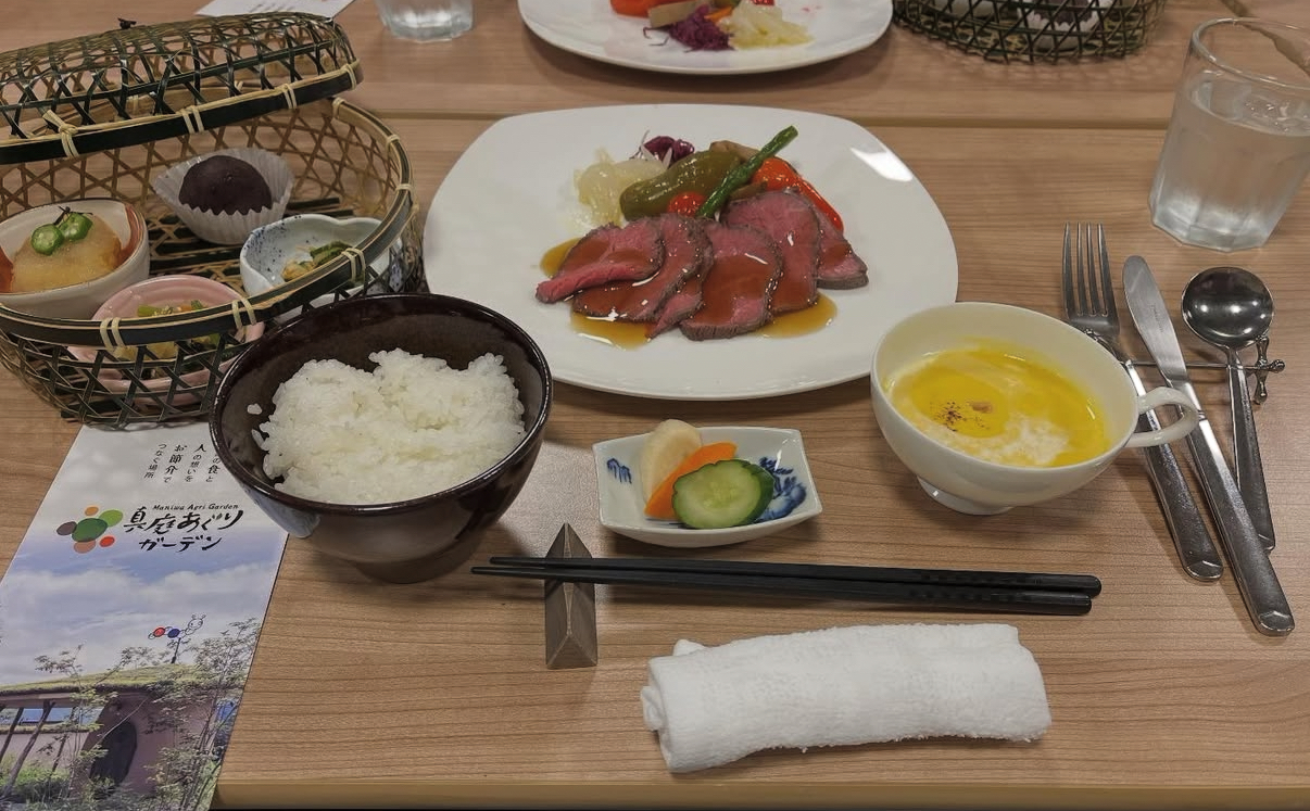 議会の総務産業委員会の視察で真庭を訪れています。ランチは、真庭あぐりガーデンでローストビーフをいただきました😄
