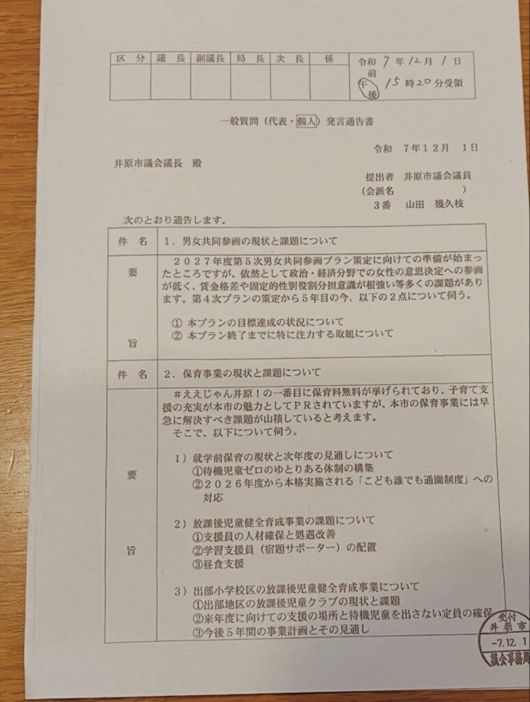 8日に12月定例会が開会された。昨日と今日合わせて8人の議員が一般質問で登壇しました。私は、15日10:00から登壇の予定です。男女共同参画の課題と現状、保育事…